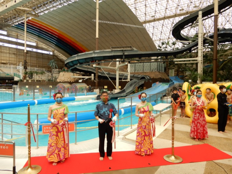 その初日には、ハワイアンズダンサー イオラナ玲奈・ウアケア佳奈子・バル憂弥・エディ勇人、常磐興産株式会社 村中大輔 執行役員らが駆けつけ、宣言を大声で客に伝えて「アロハーっ!」。