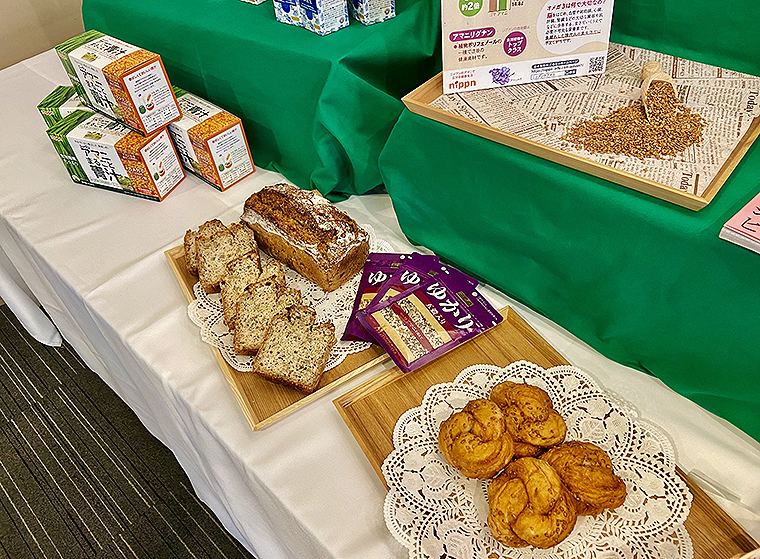 ニップン 前鶴俊哉 代表取締役社長、同加工食品部 販売促進チーム 井坂眞志チームマネジャー、同ヘルスケア事業部 有川由紀子 副部長、同ヘルスケア事業部 開発チーム 関彩華 部員らが登壇し、ニップンのアマニ商品へのこだわりなどを伝えた。