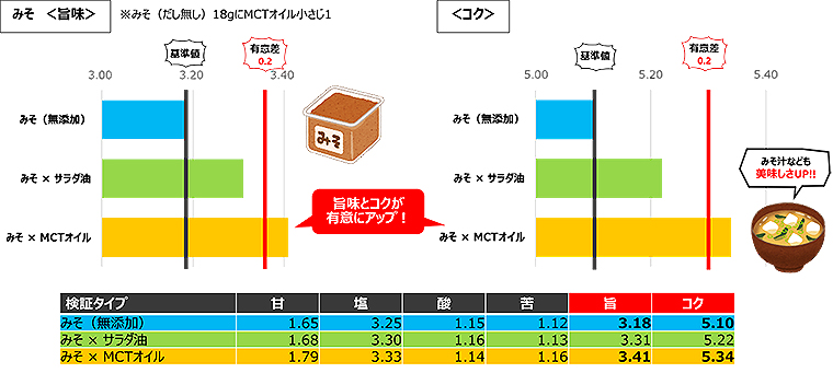以上のことから「MCTオイル」は、無味無臭なため日常の食事にプラスしやすく、様々な食事のおいしさを高めることが期待できると示唆されます。
