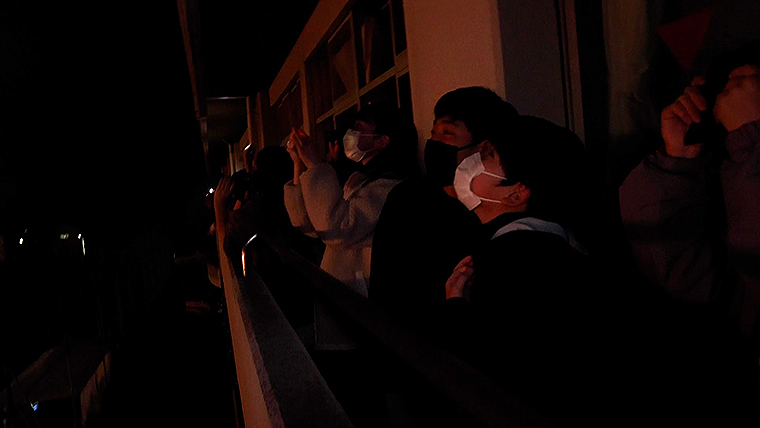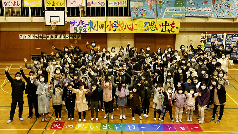 東小川小での思い出を振り返るナレーションにあわせて、地上で同校児童の愛称である「ひがしっ子」の5文字がドローンの光で描かれ、静まり返った校舎に歓声が響く。