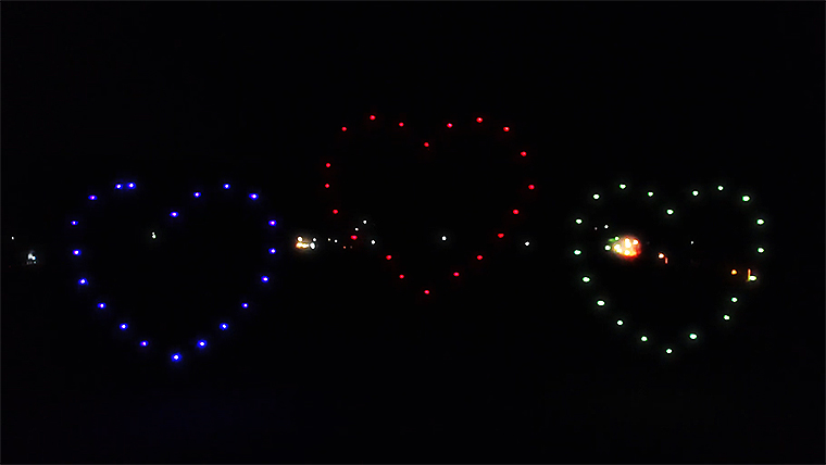 そこからドローンは上空へと飛び立ち、東小川小の児童の元気さを表す「スマイル」、全校児童が仲良しであることを表した「肩を組むシルエット」、同校を包む豊かな自然を表す「花」、児童の分け隔てのない優しさを表現する「ハート」、全校が盛り上がる年間行事の中でも特に思い出深い運動会を表す「大玉送り」と、ひがしっ子祭を表す「風船」のアニメーションを夜空に浮かんだ。