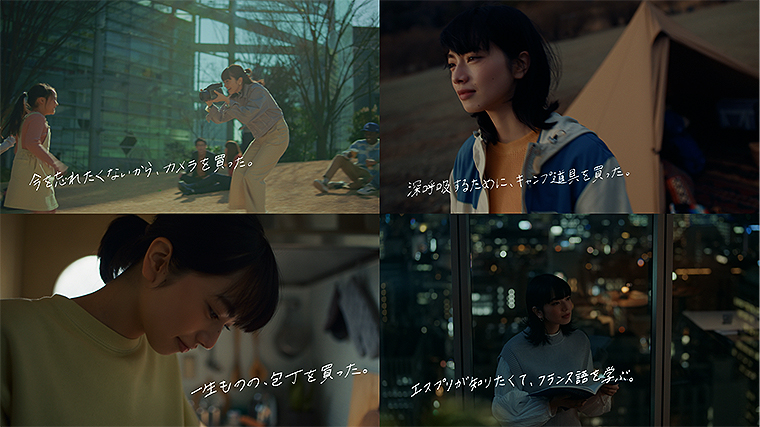同シリーズでは、4つのシーンで消費のかたちを描いたCMに仕上げ、買い物の先にある「物語」の序章を感じさせる内容に。