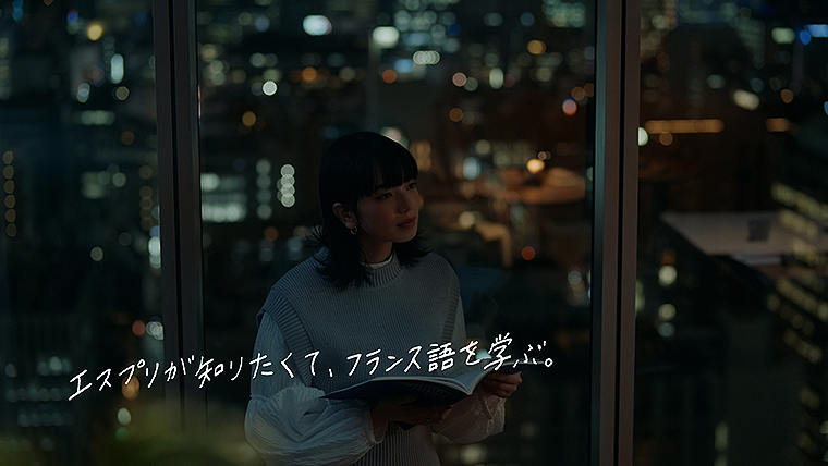 そして「フランス語」篇では、「エスプリが知りたくて、フランス語を学ぶ。」という言葉とともに、流暢なフランス語で楽しそうに先生と会話する姿を描いている。