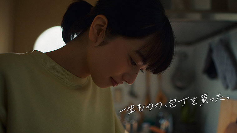 「包丁」篇では、「一生ものの、包丁を買った。」という言葉と共に、包丁で野菜を切って朝食をつくる姿を描く。