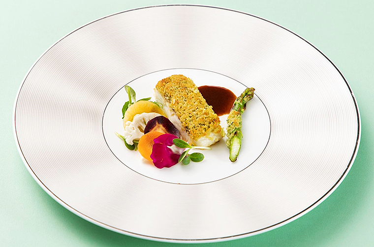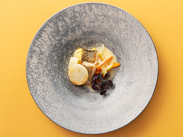 ・東京湾鱸のポワレ しんとり菜(江戸川区)と小蕪(清瀬市) ハマグリと紫芽(足立区)のナージュ
