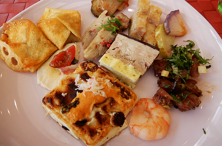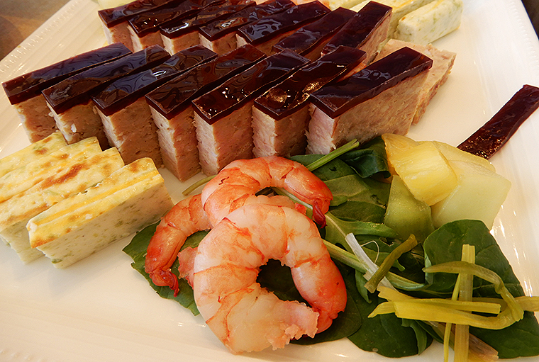 ・アグー豚のパテ ポルト酒のジュレとマセレしたフルーツを添え アーサ海苔の真丈と車エビの酢味噌ソースと共に