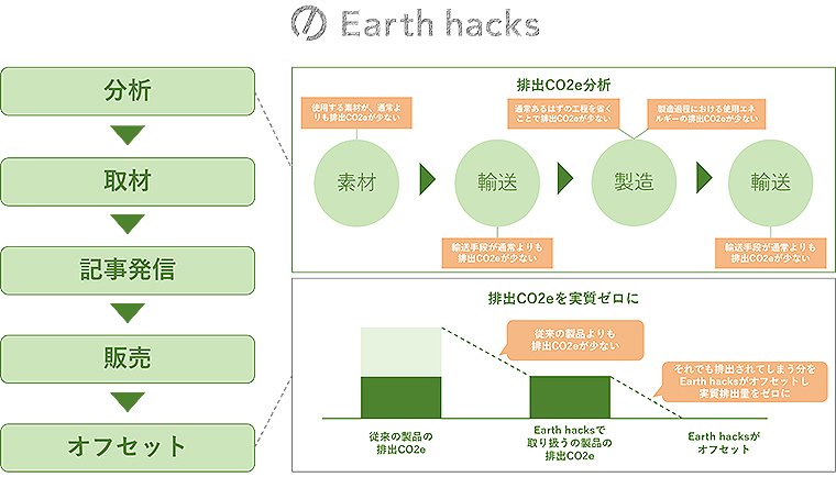 また、それでも排出されるCO2eは、カーボンオフセットができる仕組みにより、Earth hacks で購入した商品は実質カーボンフリーとなる予定。