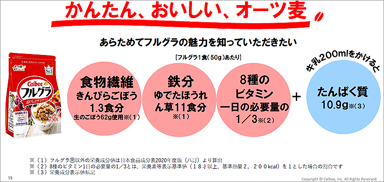 実はカルビー、オーツ麦使用商品展開で国内トップクラスの食品企業で、1988年からオーツ麦を主原料とするグラノーラの生産販売をスタート。現在ではシリアルブランド売上No.1の「フルグラ」を中心に「グラノーラプラス」や「香ばしグラノーラ」など、オーツ麦を主原料としたさまざまなシリアルを展開中。