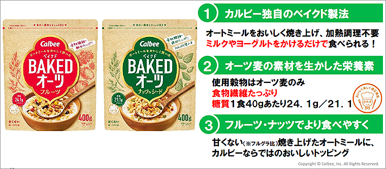 カルビーは、オーツ麦を脱穀し、食べやすく加工したオートミールを同社独自製法でおいしく焼き上げた『ベイクドオーツ フルーツ』と『ベイクドオーツ ナッツ&シード』を、4月18日から全国で新発売! 「オートミールカテゴリーのシリアル」を初めて展開する。