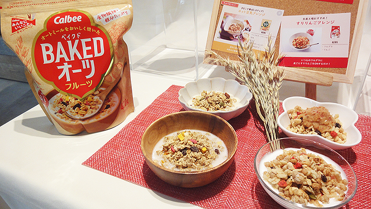 カルビー独自のベイクド製法でオートミールをおいしく焼き上げた「ベイクドオーツ」は、オートミールにフルーツやナッツをトッピングしたシリアル。