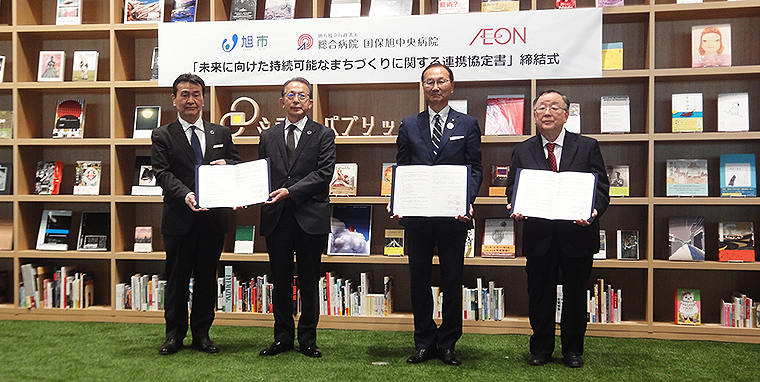 「未来に向けた持続可能なまちづくりに関する連携協定書」締結式に登壇した、イオンリテール 浜口好博 取締役常務執行役員 南関東カンパニー支社長、イオンタウン 加藤久誠 代表取締役社長、旭市 米本弥一郎 市長、総合病院国保旭中央病院 吉田象二 理事長