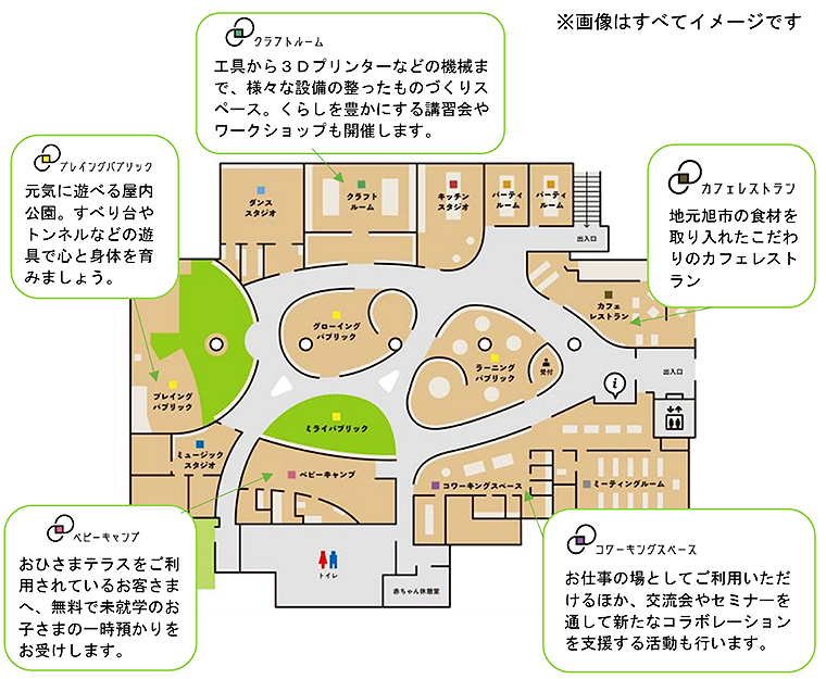 フロアには、屋内公園、コワーキングスペース、キッチンスタジオ、クラフトルームなどのレンタル・オープンスペースや、地元旭市の食材を取り入れたこだわりのカフェレストランがゆとりあるスペースでレイアウトされている。