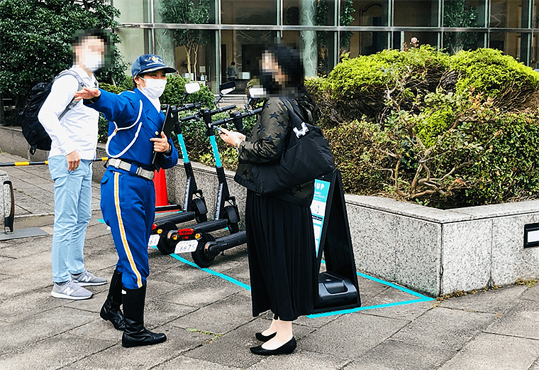 都内の主要 LUUP ポートで、スタッフが乗り方や走行ルールをレクチャーし、電動キックボードの「ご利用ガイドブック」を配布。