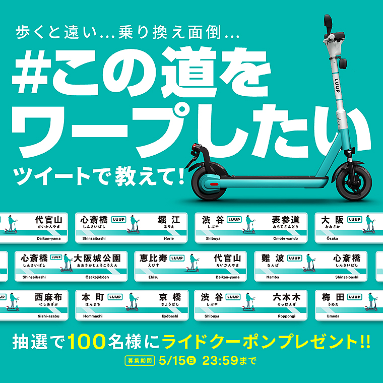 また、LUUP 公式Twitterアカウント(@Luup_Official)をフォローし、「#この道をワープしたい」のハッシュタグをつけて、LUUP で移動したいと思うルートを投稿すると、抽選で、100名に30分間ライド無料クーポンをプレゼント!