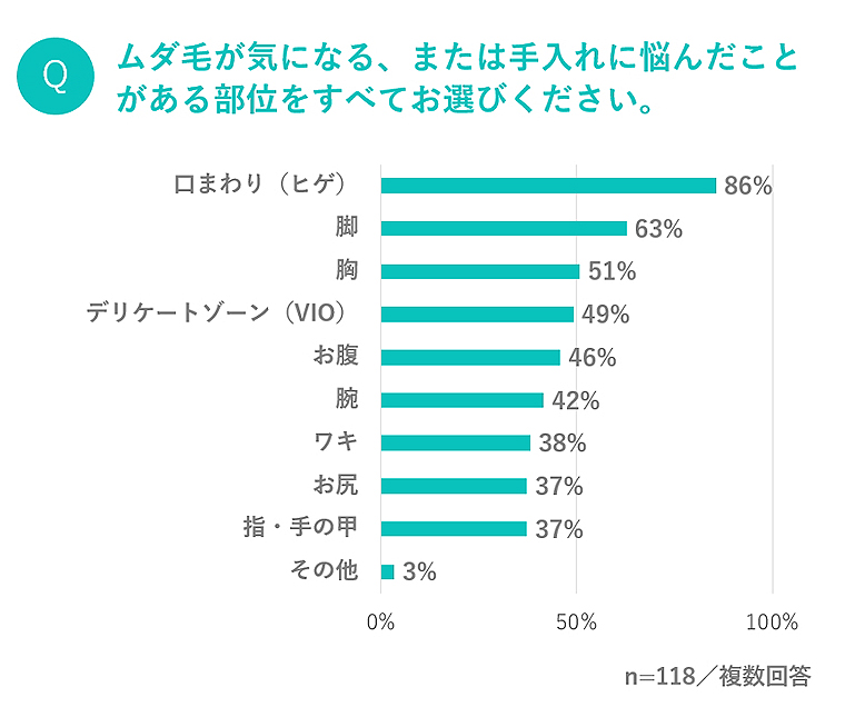 そこで「ムダ毛が気になる、または手入れに悩んだことがある部位」を質問すると、「口まわり(ヒゲ)」(86%)、「脚」(63%)、「胸」(51%)がトップ3に。