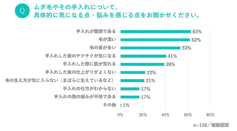 さらに、ムダ毛やその手入れについて「気になる点・悩みを感じる点」としては、「手入れが面倒」(63%)、「毛が濃い」(62%)、「毛の量が多い」(53%)、「手入れした後のチクチクが気になる」(41%)などの回答が多く、手入れの煩わしさや毛の濃さに悩みを感じている人が多かった。