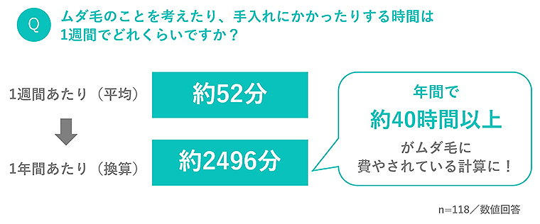 これは1年あたりに換算すると「約2496分=約41.6時間」、年間で40時間以上がムダ毛に費やされていることに。