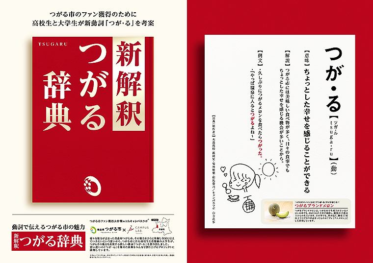 この「新解釈つがる辞典」は、つがる市にある青森県立木造高校の生徒15名の「地元で感じるつがる市の特徴」と、キャンパスラボの首都圏在住女子大生メンバー6名の「首都圏から感じるつがる市」の印象を、意見交換しハイブリッドさせて魅力をブラッシュアップ。