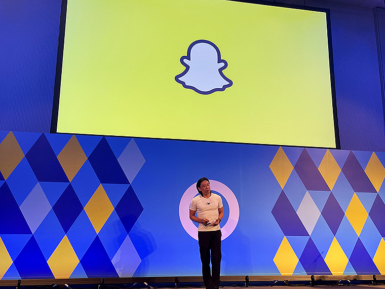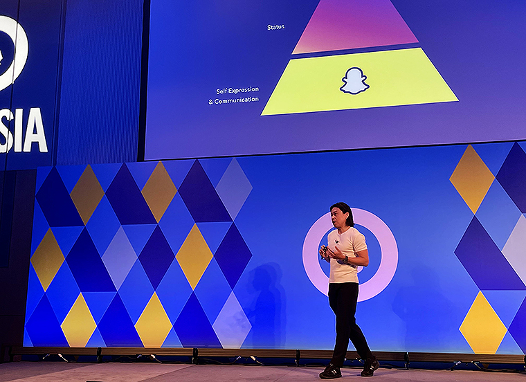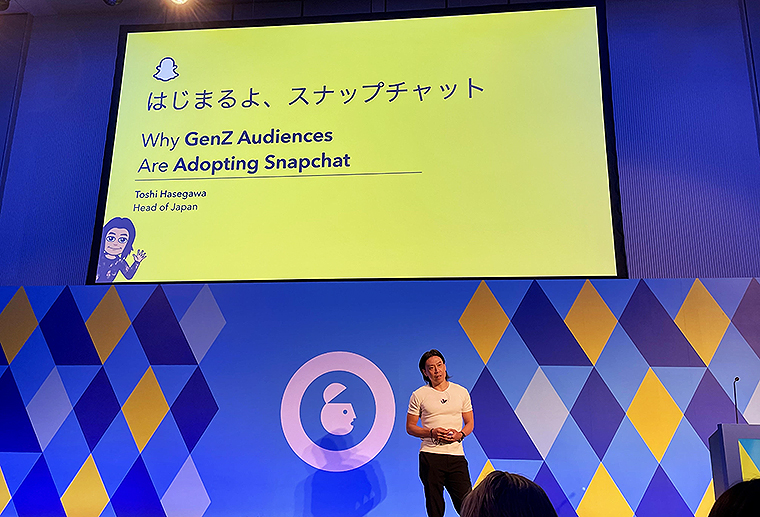 多くの聴衆を前に「なぜZ世代のオーディエンスは Snapchat を利用するのか?」をテーマにプレゼンテーション。Snapchat のコアプロダクト価値とプラットフォームの差別化要因について持論を展開した。