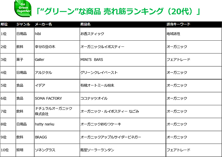 「“グリーン”な商品 売れ筋ランキング(20代)」では、兵庫県の伝統産業によって生産された「お香スティック」が1位に。