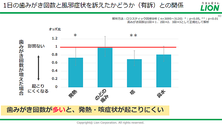 1日の歯みがき回数と風邪症状を訴えたかどうか(有訴)との関係では、「歯みがき回数が多いと、発熱・咳症状が起こりにくい」という結果に。