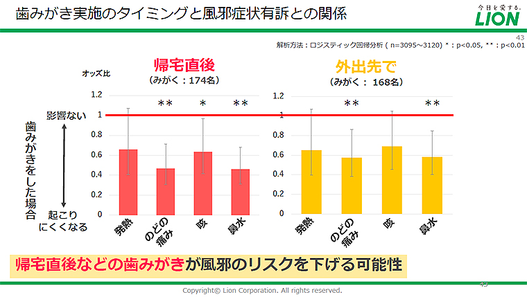 また、歯みがき実施のタイミングと風邪症状有訴との関係では、「帰宅直後などの歯みがきが風邪のリスクを下げる可能性」があると公表。