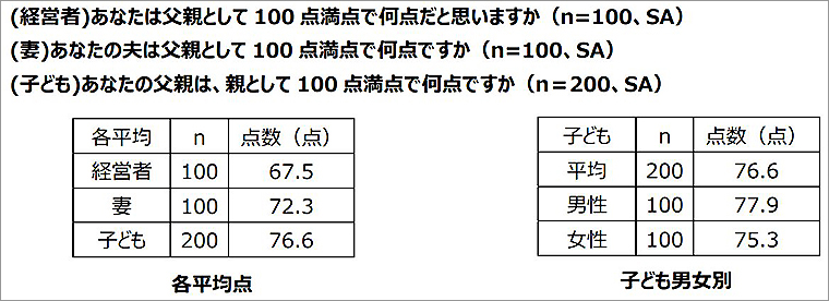 中小企業経営者の父親としての自己採点は100点満点で平均67.5点。中小企業経営者の妻は平均72.3点、中小企業経営者の子どもは平均76.6点だった。