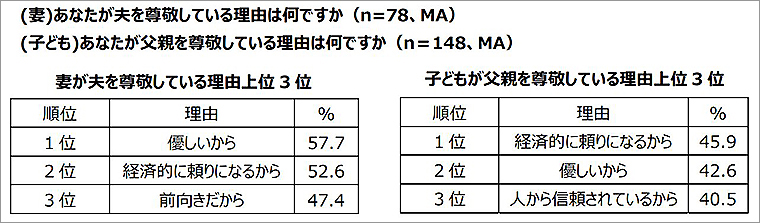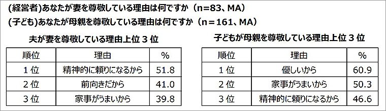妻が中小企業経営者の夫を尊敬している理由1位は「優しいから」、子どもが中小企業経営者の父親を尊敬している理由1位は「経済的に頼りになるから」だった。