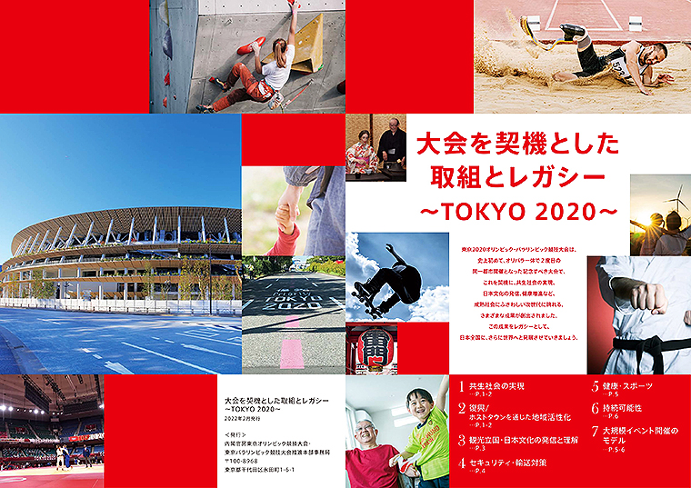 内閣官房オリンピック・パラリンピックレガシー推進室は、「共生社会の実現」「復興・ホストタウンを通じた地域活性化」「観光立国・日本文化の発信と理解」「セキュリティ・輸送対策」「健康・スポーツ」「持続可能性」「大規模イベント開催のモデル」という7つのテーマを軸に情報を国内外に発信。