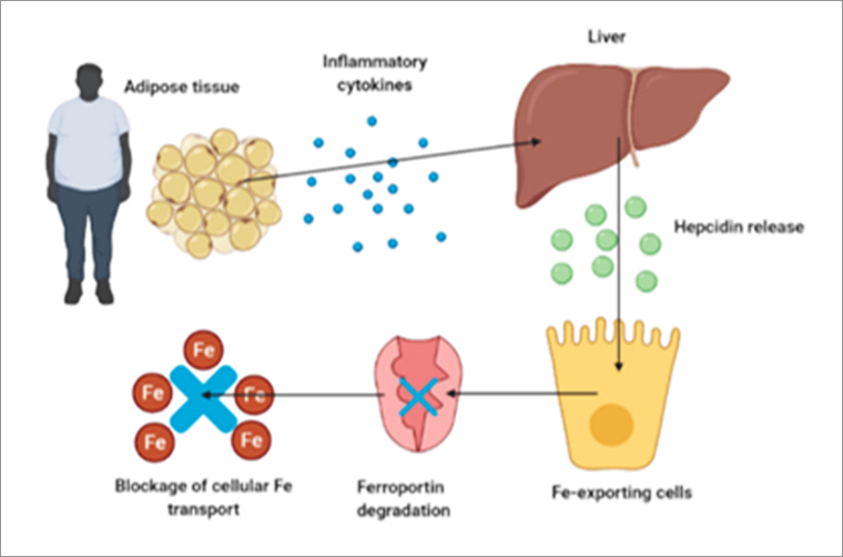 「肥満であること」自体が、腸管細胞から鉄を吸収しにくい状況を引き起こし、鉄欠乏ならびに貧血の一因となっていることが、最新の研究で分かってきた。