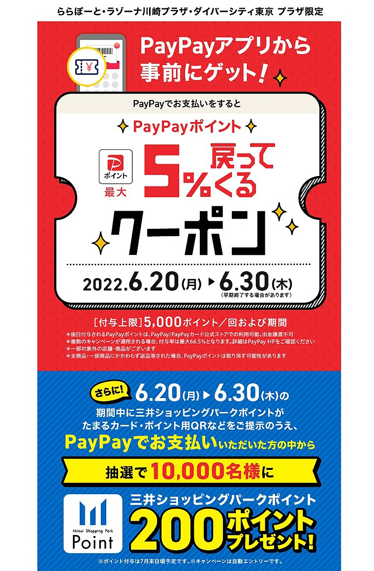 この7月からの「ららぽーとバーゲン」に先立ち、6月20日~6月30日の10日間は、ららぽーと各施設の対象店舗で、PayPayポイント最大5%戻ってくるクーポンなどPayPay支払いでおトクなキャンペーンを実施!