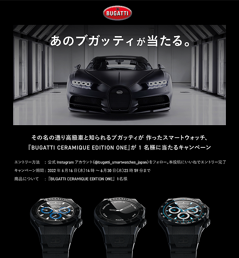 「あのブガッティが当たる。Instagramキャンペーン」は、その名の通り世界的高級車と知られるブガッティがつくったスマートウォッチ『BUGATTI CERAMIQUE EDITION ONE』(ブガッティセラミックエディションワン/売価格税込35万円)が1名に当たるキャンペーン。