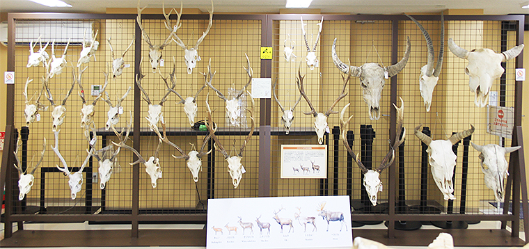 しかも、ゾウの顎(アゴ)の骨、シカの頭や脚(あし)の骨、ウマやイノシシやイヌの頭の骨などいろいろあって、骨格標本を見ながら、バラバラの骨がどこの部分のものか、それらがどうつながっているかも体感できる。