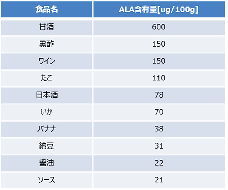 また 5-ALA は、動物や植物などあらゆる生命体のミトコンドリアでつくられる天然のアミノ酸で、基本的には食品全般に含まれている。