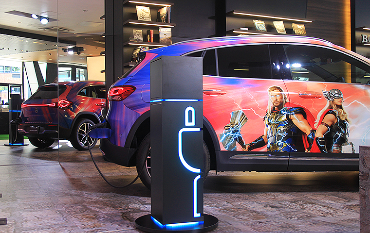 さらにその横には、7月8日公開劇場映画「ソー:ラブ&サンダー」の世界観を体現したメルセデス・ベンツ電気自動車SUV「EQA」が!