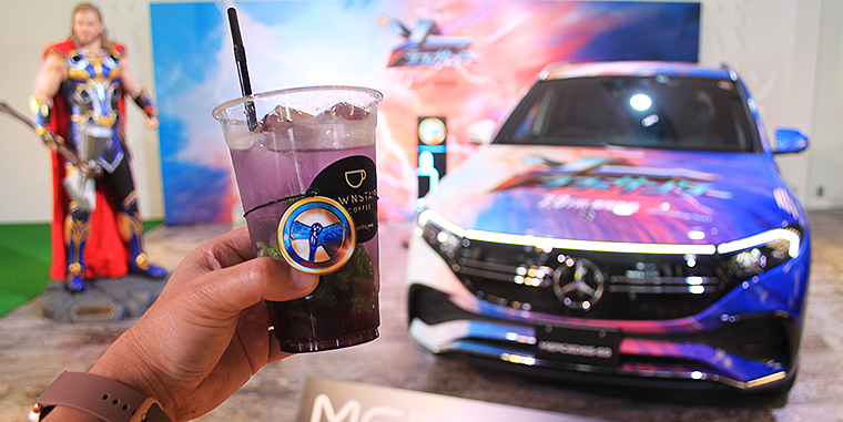 激アツなマーベル・スタジオ劇場映画最新作「ソー:ラブ&サンダー」の世界観にハマったあとは、メルセデス ミー東京(六本木)・メルセデス ミー大阪の「DOWNSTAIRS COFFEE」(カフェ)で、期間限定提供中のスペシャルドリンク3種(ノンアルコール/各700円)で身体をクールダウン。