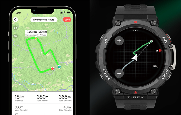 デュアルバンドと5つの衛星(アメリカGPS・ロシアGLONASS・EU Galileo・日本QZSSみちびき)による高精度な測位で、ナビゲーション機能も多彩で頼れる。知らない道でも、Amazfit T-Rex 2 が正確に位置・ルートを示してくれるのもうれしい。