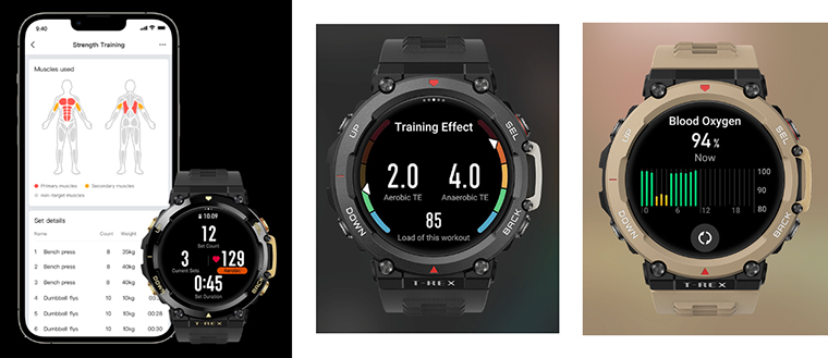 Amazfit T-Rex 2 には、15+8の筋力トレーニングを自動認識し、レップ数をカウントできる。トレーニングの多くはZeppアプリで調整でき、セット間の休憩時間も追跡してくれるから、総合的なトレーニング効率をキープできるのもうれしい。