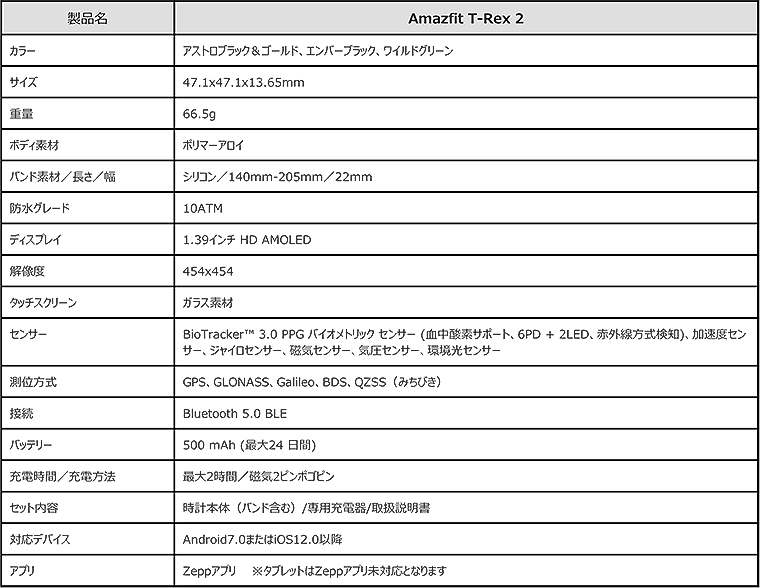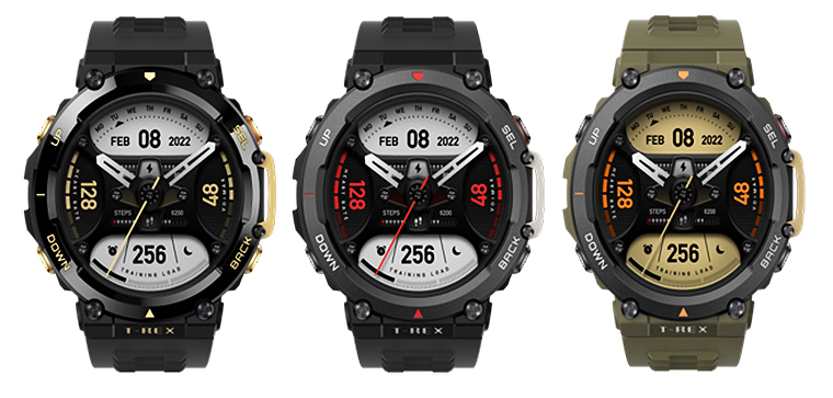 アストロブラック&ゴールド、エンバーブラック、ワイルドグリーンの3色から選べる Amazfit T-Rex 2 。その詳細スペックやここで紹介しきれなかった機能などについては、公式サイトをチェックしてみて↓↓↓