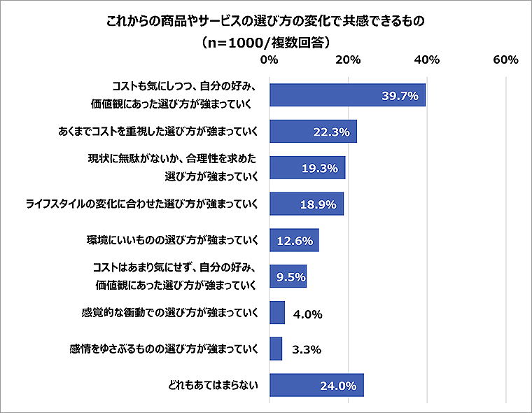 商品やサービスの選び方は新型コロナウイルス感染症や物価上昇、SDGsなどの影響を受け、さまざまに変化している。約4割の人が「コストも気にしつつ、自分の好み、価値観にあった選び方が強まっていく」と考えていることがわかった。