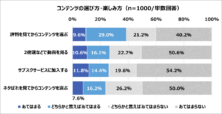 今後どのようなものを消費者は選んでいくのか、「環境」「SDGs」に焦点を絞り詳細を調べたところ、37.0%と約3人に1人が環境にやさしいものやSDGsを意識して選ぶようになったと回答。ジャンルでは「食品」が最も多く64.9%、次いで「生活雑貨」31.4%、「ファッション」25.9%と続き、エシカル消費への興味関心の高まりにより、一番身近で必要不可欠な「食品」をはじめ、乗り換え消費が進んで行くことが予想される。また、「タイパ(タイムパフォーマンス)」はエンタメ系コンテンツのセレクトで顕著に表れる結果に。