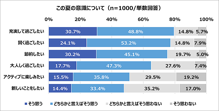 この夏は、「充実して過ごしたい」と思っている方は「そう思う」30.7%、「どちらかと言えばそう思う」48.8%と計79.5%となり、各項目の中で最も高くなった。また、「節約したい」という方が計75.3%いる一方で、「アクティブに楽しみたい」計51.3%、「新しいことをしたい」計47.8%と、今年の夏は消費や行動を変える「内から外」への動きが見て取れる結果に。