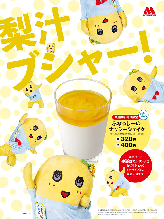今回は、千葉県で栽培されている和梨を使用し、千葉県船橋市の非公認ゆるキャラである“ふなっしー”とコラボした商品、「ふなっしーのナッシーシェイク」を数量・地域限定で新発売しています。(千葉県と茨城県のモスバーガー68 店舗にて ※一部店舗を除く)