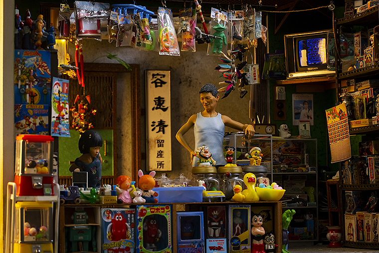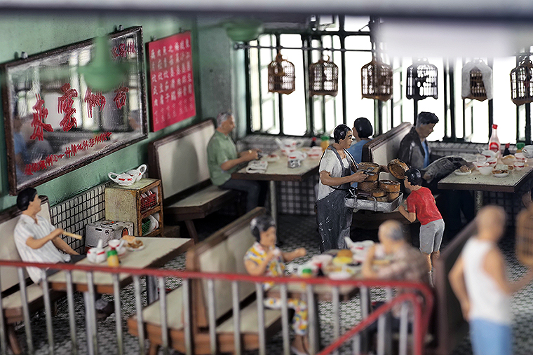 今回の香港ミニチュア展でも、かつて香港の工業地帯であった観塘(クントン)の繁華街で、いまは再開発がすすむ裕民坊の前を人々が忙しく行き交うようすを描いた「観塘の繁華街」や、自慢の愛鳥を連れて来店し、飲茶を楽しんでいた懐かしい風景が再現された「レトロな飲茶店」、1970年代に、九龍城の古い建物の階段下で営業していた「昔のおもちゃ屋」など、香港の伝統を感じさせてくれるミニチュアを展示。