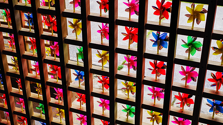 さらに、水槽の背景にはたくさんの風車が並び、夜にはライトアップされ、和の美しい世界が。