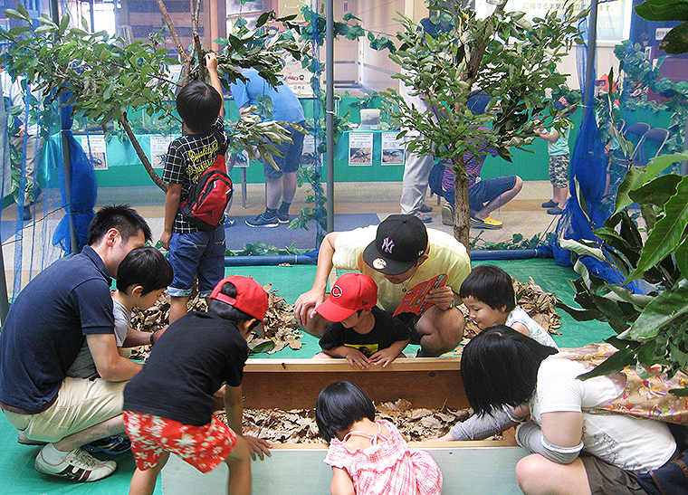 昆虫ふれあいコーナーでは、約80匹もの日本原産のカブトムシとクワガタムシと触れ合える。