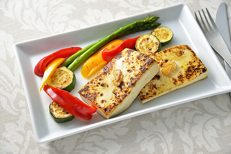 同社の充てん豆腐従来品と比較しても、なんと2倍の硬さに。画像は「かためのおいしい豆腐」ステーキ。