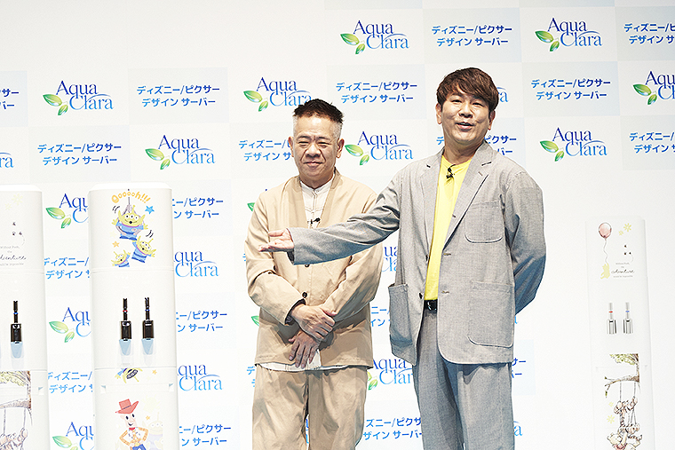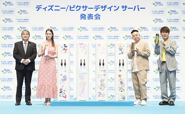 アクアクララ「ディズニー/ピクサーデザイン サーバー」発表会には、アクアクララ サステナアンバサダーに就任したトラウデン直美、FUJIWARA 藤本敏史・原西孝幸、そしてアクアクララ 赤津裕次郎 代表取締役社長 が登場。