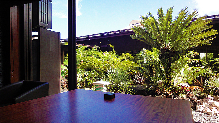 ブースから見える景色は南国リゾート感を味わえる庭園が、食事中の非日常をいっそう演出してくれる。渡部正紀(ふじのくに食の都づくり仕事人)料理長の絶品地元和食メニューにも注目を。