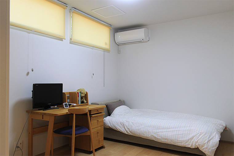 2階のメインエアコン(冷房)を 26度設定で ON にしているだけで、子ども部屋や主寝室がある1階にも冷気が届き、27~28度をキープ。